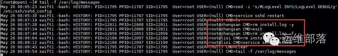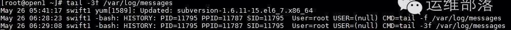 6、注销当前root用户,重新登陆后,查看/var/log/messages,如下就可以看到记录了操作命令